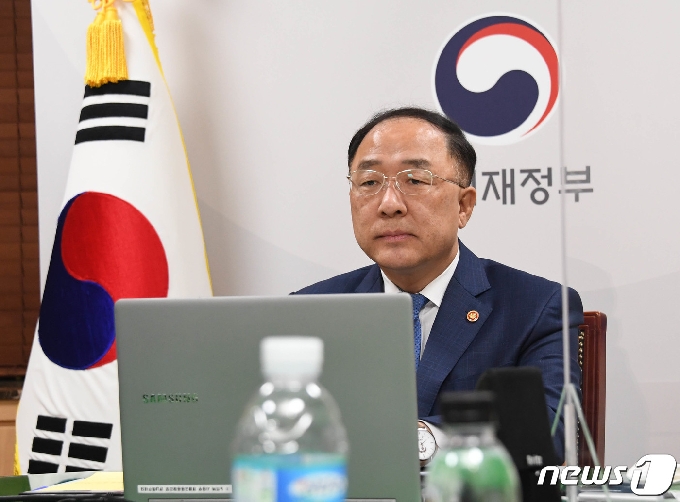 (서울=뉴스1) = 홍남기 부총리 겸 기획재정부 장관이 지난 16일 서울 세종대로 정부서울청사에서 화상회의로 열린 '세계은행(WB) 개발위원회(DC)'에 참석하고 있다. (기획재정부 제공) 2020.10.17/뉴스1