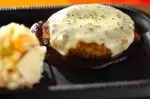 4、弱火にし、フライパンに蓋をして5~6分蒸し焼きにする。ハンバーグの中央に竹串を刺し、澄んだ汁が出たらスライスチーズをのせ、フライパンに蓋をする。スライスチーズが溶けたらハンバーグは取り出しておく。(ヒント)竹串を刺し、濁った赤い汁ならもう一度蓋をして焼く。